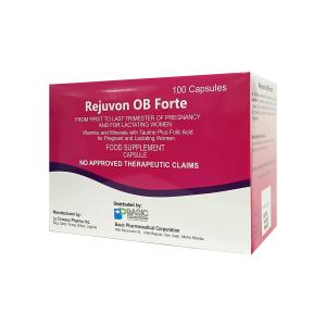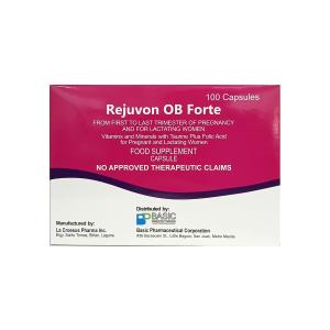 REJUVON OB FORTE is a food supplement for pregnant and lactating women. It contains Calcium, Vitamin C, Taurine, Vitamin B3, Iron, Vitamin E, Zinc, Vitamin B6, Vitamin B2, Vitamin B1, Vitamin A, Folic Acid, Vitamin D3, and Vitamin B12.